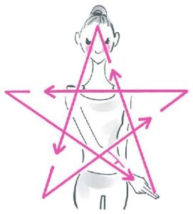 1 カバラ十字を行ったあと、そのまま東向きで続けます。右手をカバラ十字と同じように剣印にします。始点を左腰、頂点を額あたりとして、上半身ほどの大きさになるように五芒星を描きます。できるだけ形が歪まないように、指先から光を放ち、それが残像となるようにイメージすると均等のとれたきれいな形になります。