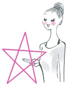 ②きれいに描くには、まず円を描きます。その周囲を72度ずつ5等分にし、星の頂点を決めます。頂点を一筆書きで結べば、均等な五芒星ができ上がります。