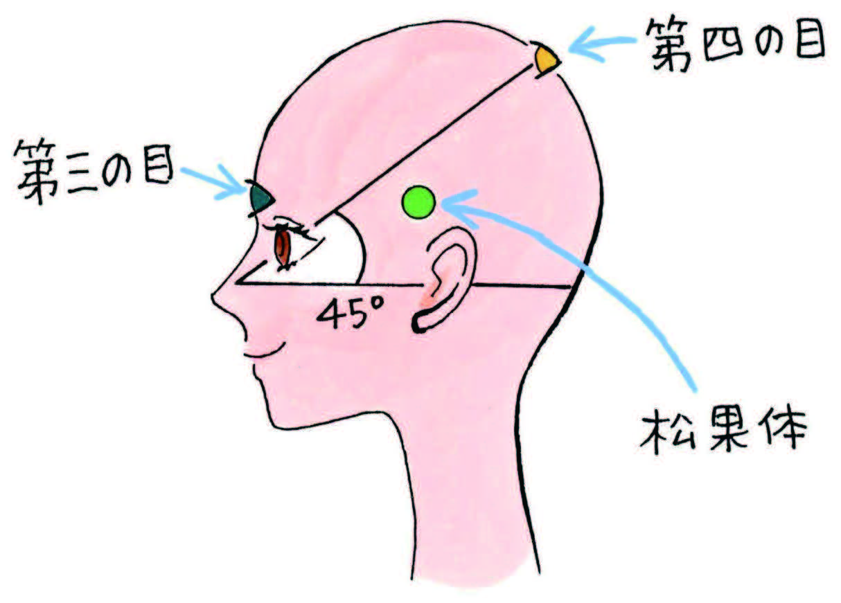 第四の目は後頭部にあるのね。鼻から45度の後ろに伸びた頭の中。このことは、ドランヴァロの『フラワー・オブ・ライフ』(ナチュラルスピリット)にも書いてあります。