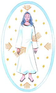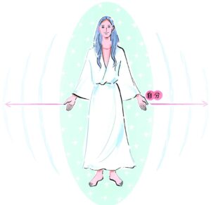 半霊半物質のエネルギー体で、霊が7で物質が3くらい。アセンデッドマスターより少し低いくらいです。いまは、「自分」というものの感覚が「肉体+5〜10cm」くらいの人が多いと思いますが、波動上昇して非物質化していくと、肉体を取り巻くエーテル体、アストラル体、メンタル体、コーザル体などのライトボディまで含めて自分なのだ、という知覚になっていくので、自分のテリトリーも大きくなっていくんです。いまの肉体を中心にすると、直径8mくらいが自分の領域になります。