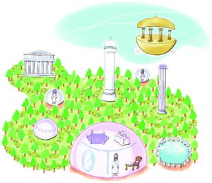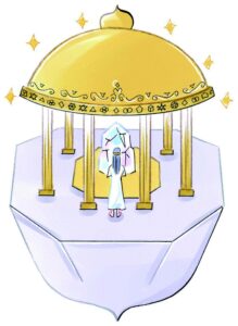 ドームの家のほか、空中に浮かんでいる建物もありました。神殿でしょう。ギリシャ柱のようなオベリスクもありますよ。いま教えてくれたのですが、神殿の柱は、断面に切ると、神聖幾何学になっているそうです。現在の遺跡も、そういう作りになっているものは、未来も残るのだそうです。